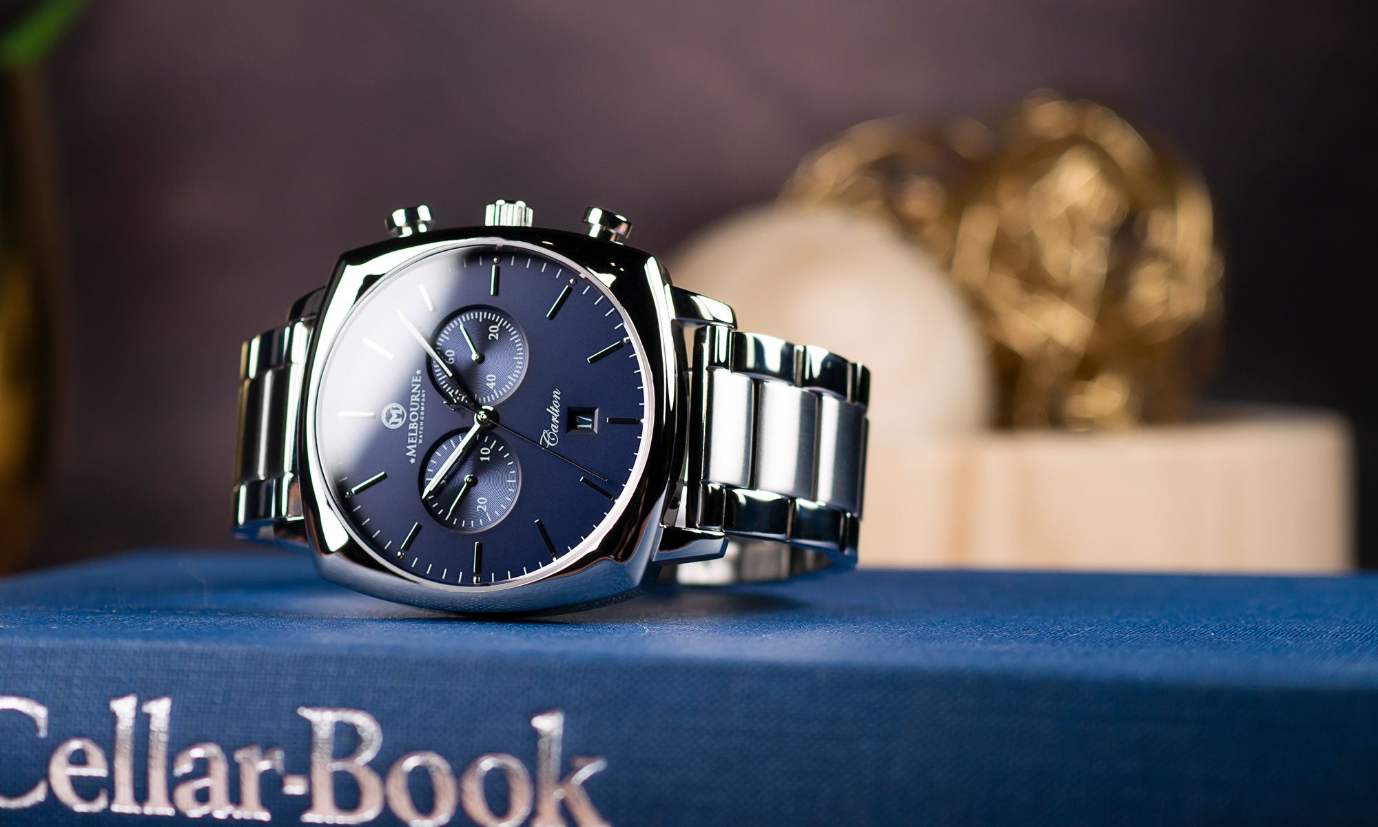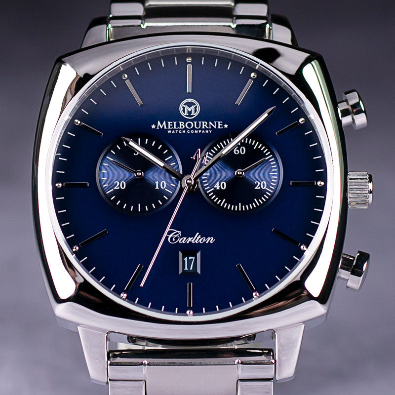 The Carlton features a polished cushion case and retro dial design inspired by 1960's watch styles.