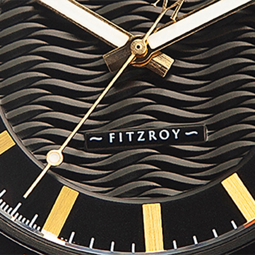 The Fitzroy dial features an intricate wave pattern and is surrounded by stainless steel indices with luminous markings.