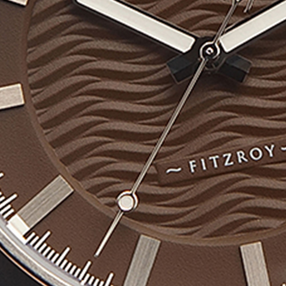 The Fitzroy dial features an intricate wave pattern and is surrounded by stainless steel indices with luminous markings.
