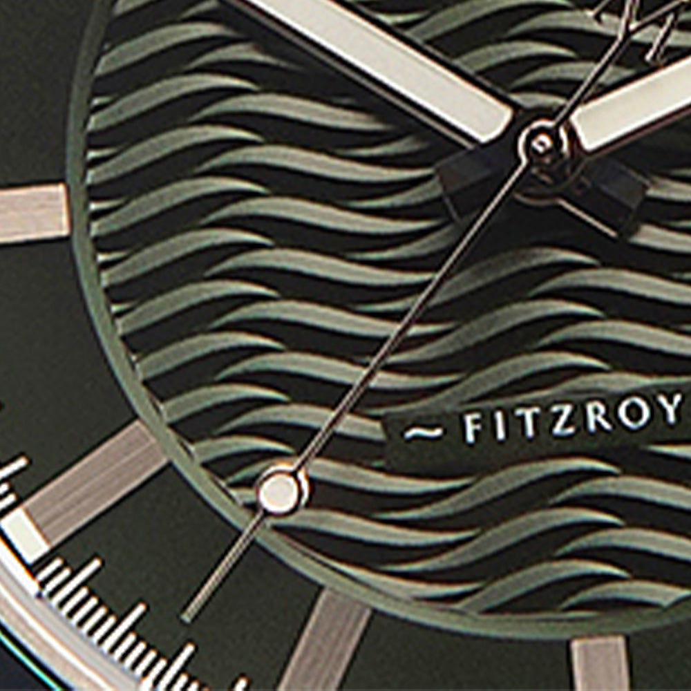 The Fitzroy dial features an intricate wave pattern and is surrounded by stainless steel indices with luminous markings.
