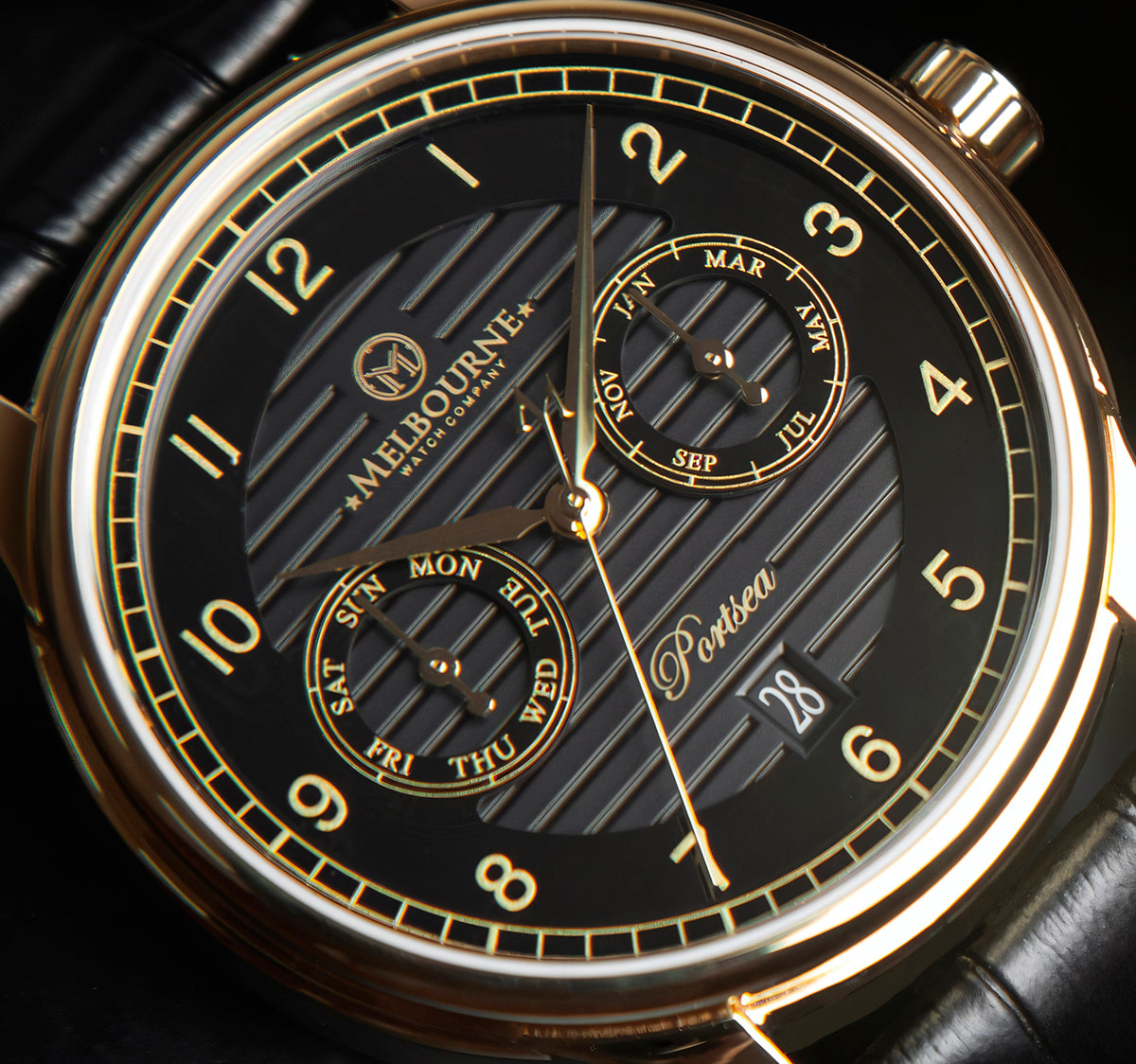 I got the Portsea Triple Calendar in rose gold and white dial and I am absolutely in love with this watch. I think they hit a bullseye with the design on this one. What you get for the price I think is pretty solid. It’s got a respectable Miyota auto movement and the 28,800 vph makes the large seconds hand a joy to watch — bonus points for the cool “M” on the seconds counter balance. Hands are a matter of preference, but I happen to like sword hands and they complement the watch well. The dial itself is probably one of my favorite features, especially in white. The way it catches light is sublime and the horizontal reliefs maintain just enough shadow such that texture can be seen even from afar.